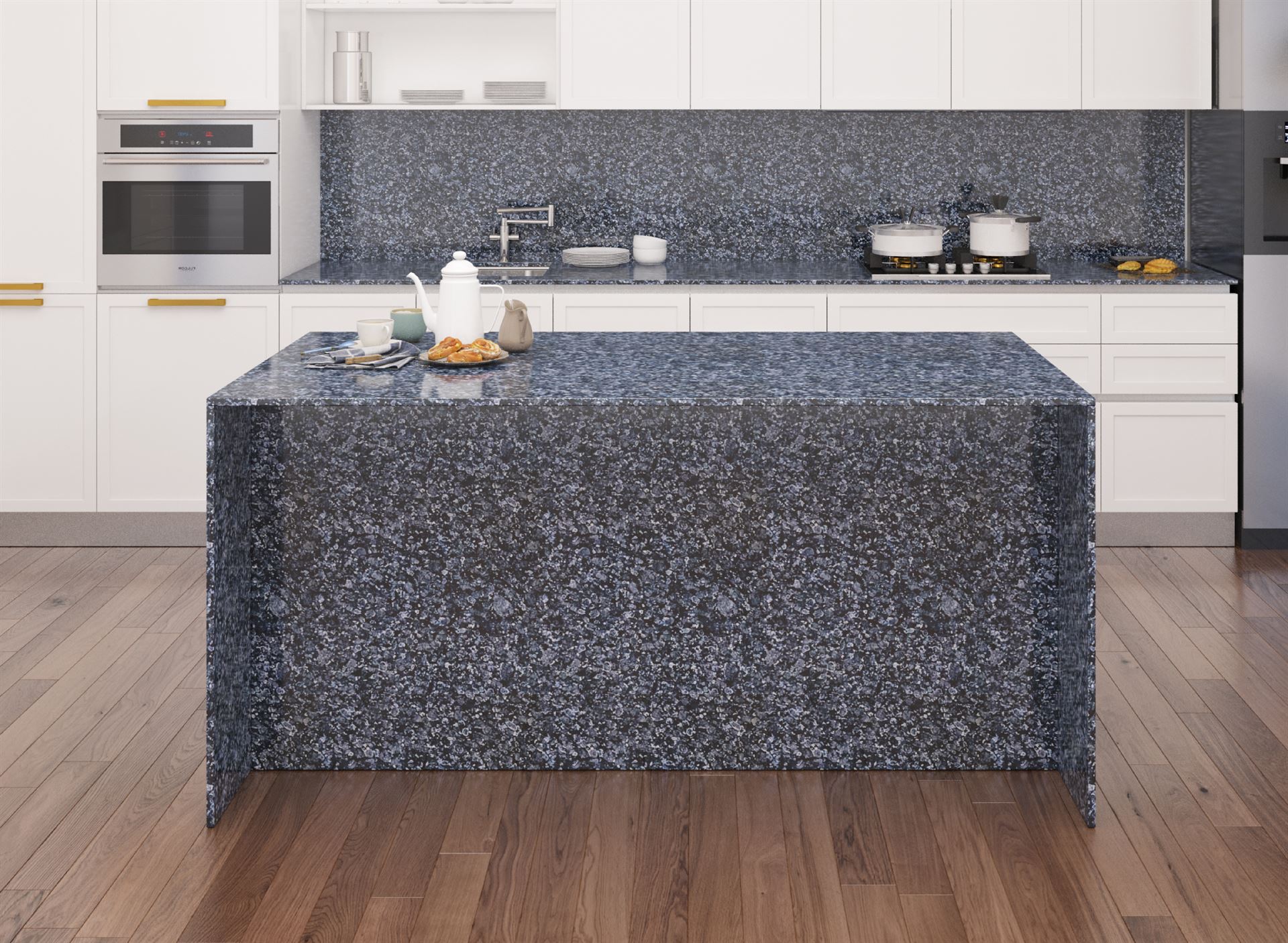 Crystal Blue Granite features a cool blue-grey base enriched with shimmering crystal-like mineral patterns.