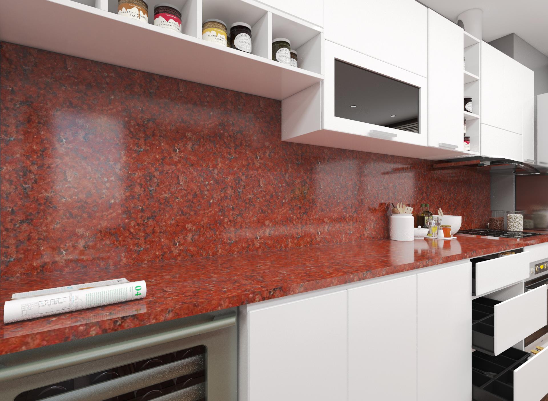 Ruby Red Granite features a rich red background with fine black and dark grey mineral grains.